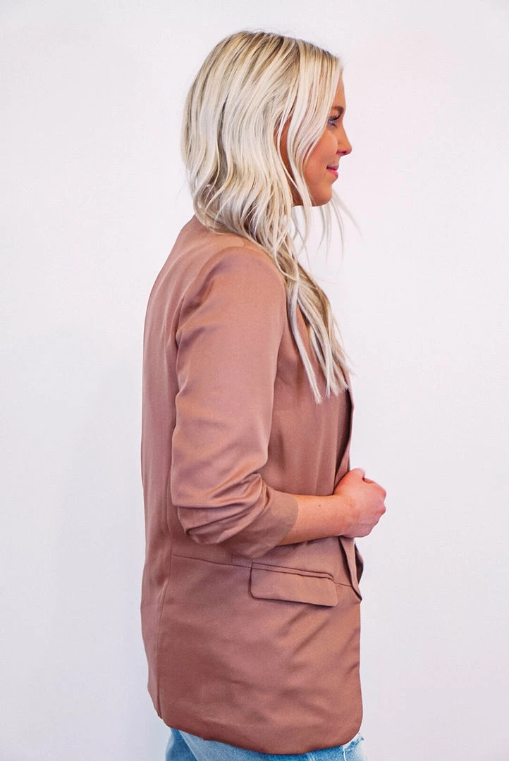 Blazers are all the trend right now, and this hazelnut one is perfect! This beauty features a woven fabric, with shirred detailing on the 3/4 length sleeves. She also has a relaxed silhouette fit, with faux pockets for a tailored look that lays smooth, and a small shoulder pad to give just the right Omph! Dress this baby up or down!