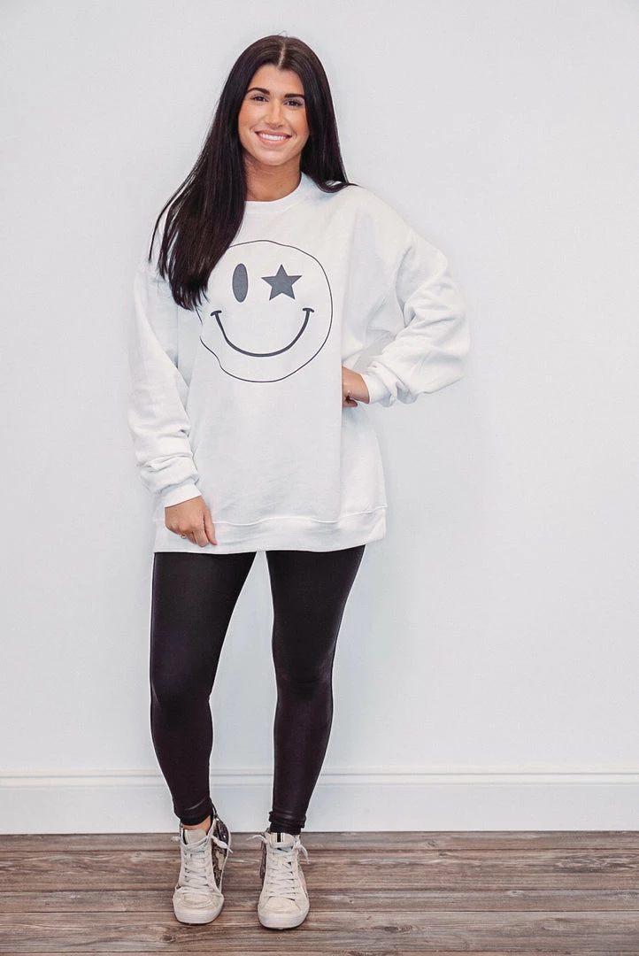 You will be happy in this oh so cute but comfy sweatshirt. The smiley face is such a fun trend and we are loving this fun star smiley design! Featuring crew neckline, cuffed long sleeves, and banded bottom hemline. Also in YOUTH HERE!