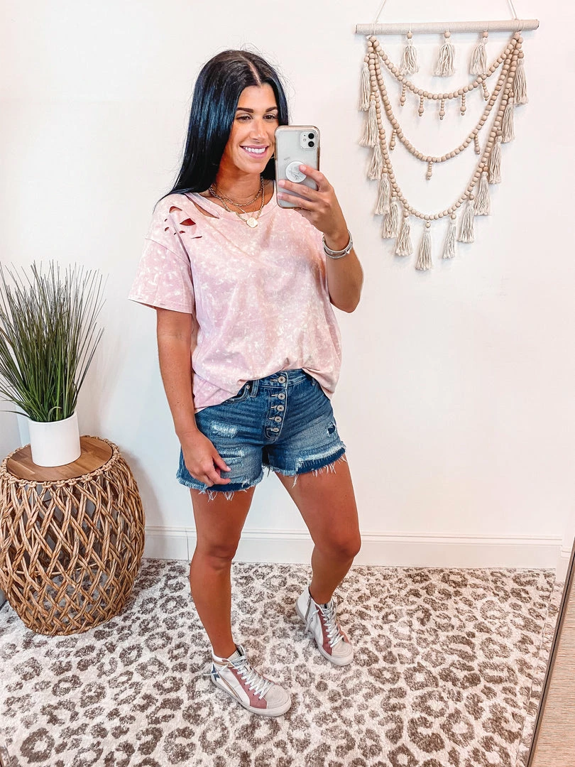 This is the most comfy distressed tee, not to mention so super CUTE! Featuring light pink washed fabric, short sleeves, and laser cut outs on the front and back for a perfect vintage look. With the soft fabric and loose relaxed fit, you’ll want to wear this babe every day! Whether heading out, or staying in, this top will look adorable anywhere you take her, and keep you comfortable everywhere you go.