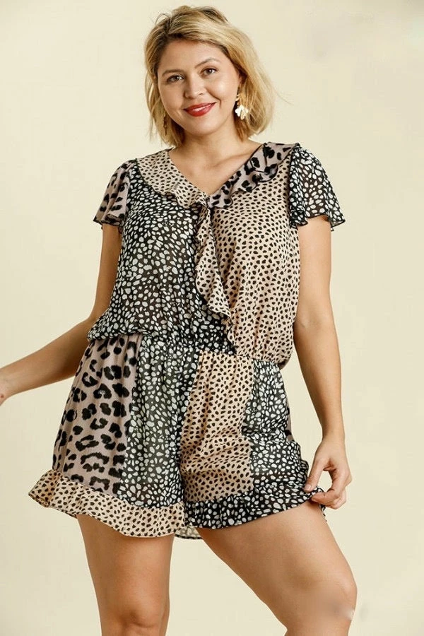 mixed animal print ruffle romper black and mocha