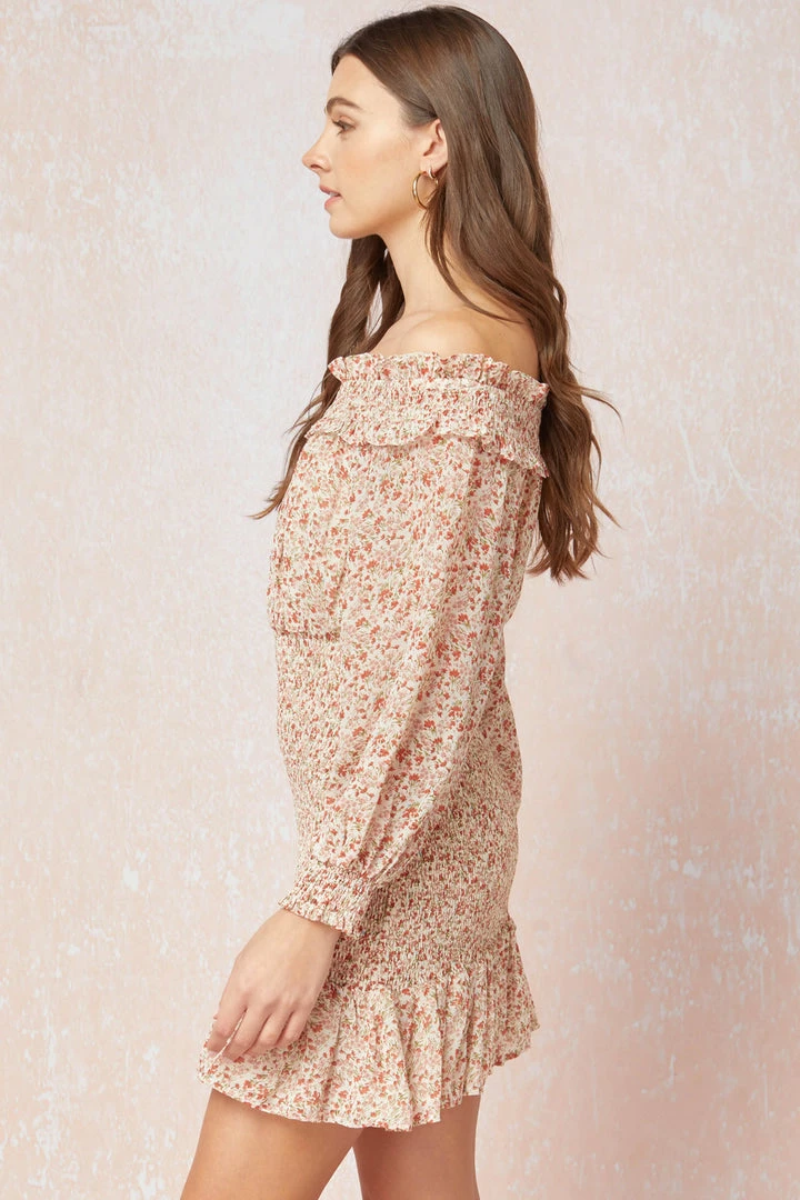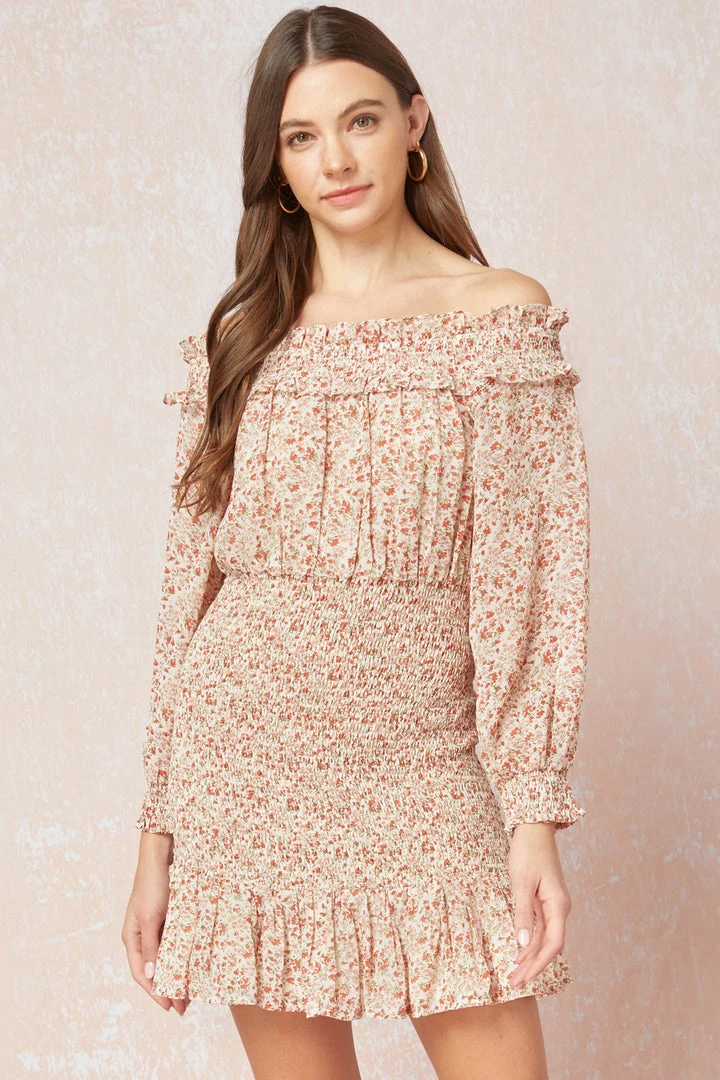 We are floral obsessed with this off the shoulder long sleeve dress! Featuring smocked details at the neckline, the sleeve cuffs, and from the waist down, with a ruffled hemline, and ruffles around the neckline. The lightweight fabric is super cute and comfy. This babe will be perfect all year long, just add boots or booties, and a denim jacket and you’re all set!