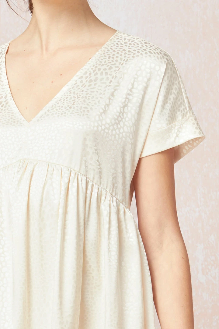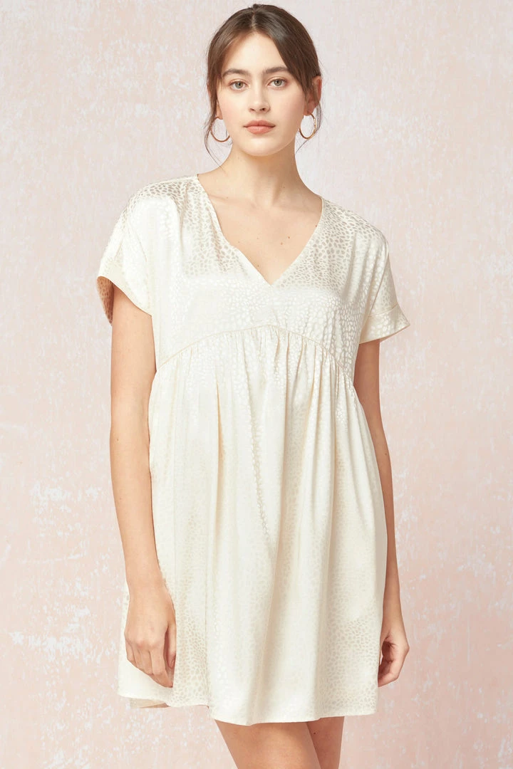The most loved babydoll fit dress in a fabulous satin spotted spring! Cream dress features a v neckline, cuffed sleeves & side pockets (lays flats on the body). This would be the perfect dress for your bridal showers!
