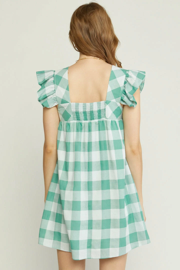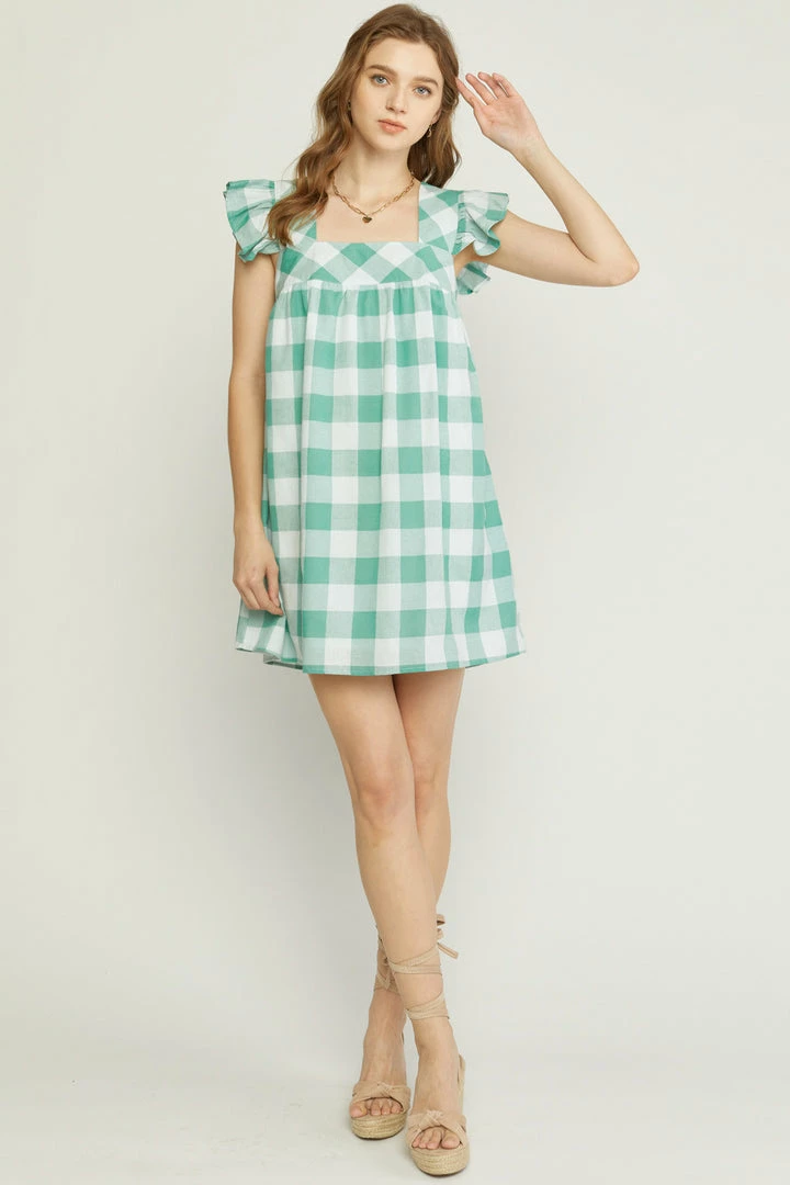 Green and white gingham babydoll dress