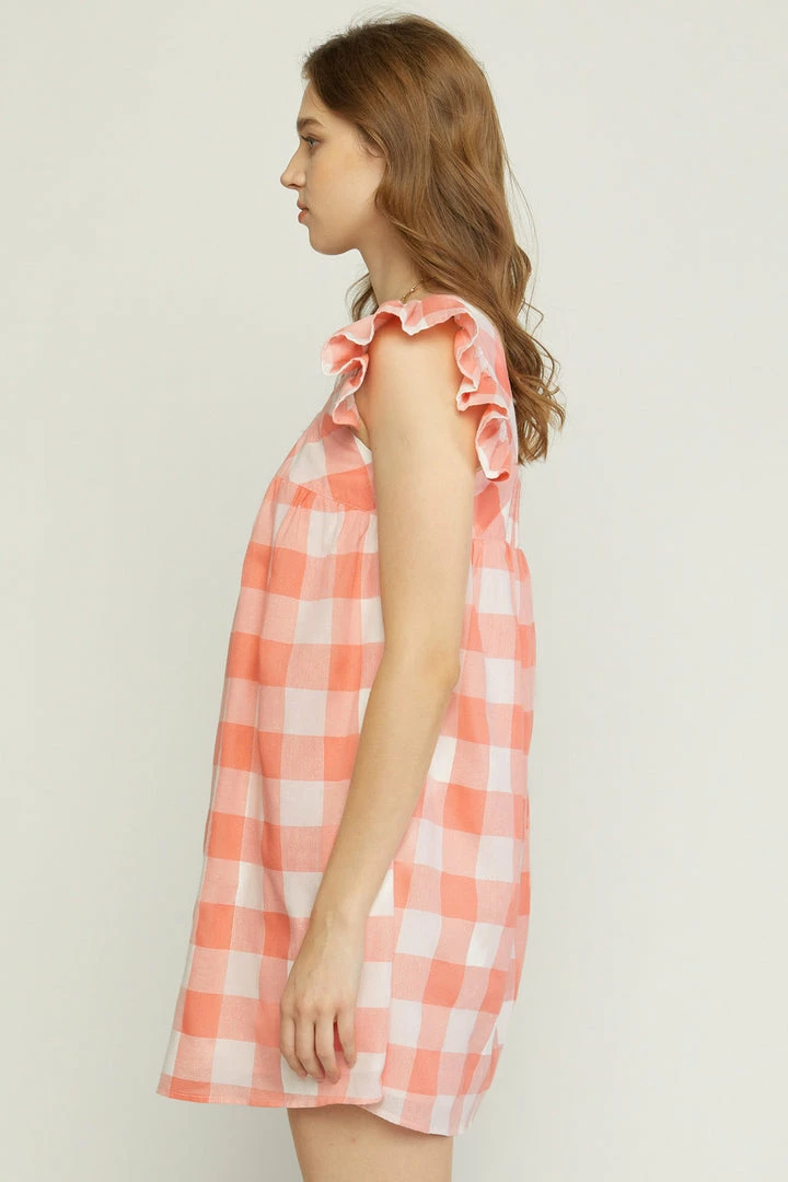 Get ready for all of your upcoming events with this super sweet babydoll dress. Featuring a lightweight flowy peach and white gingham fabric, square neckline with smocked back, and ruffle capped sleeves. This babe is perfect dressed up with heels, or wear her under your favorite cropped denim jacket with booties for a more casual look.