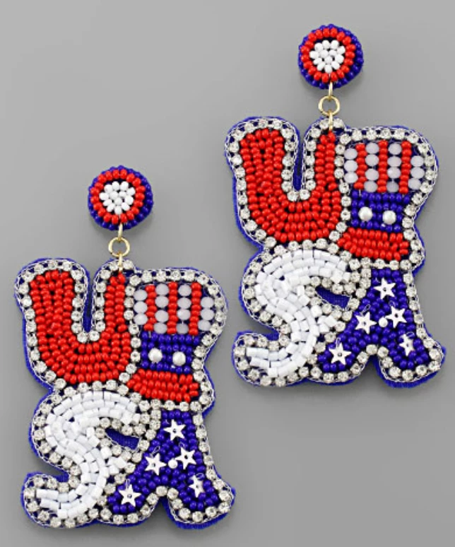 The cutest red, white and blue earrings for any 4th of July or Memorial day event! They are fully beaded and so much fun. They even have “diamonds” lining the outside frame. So patriotic!