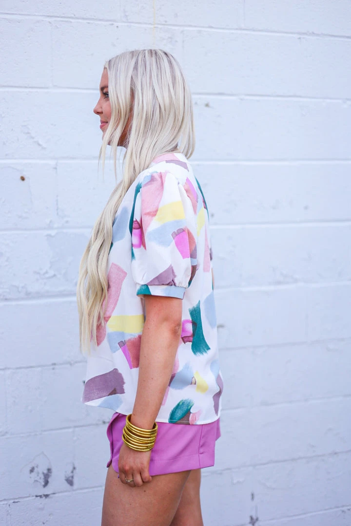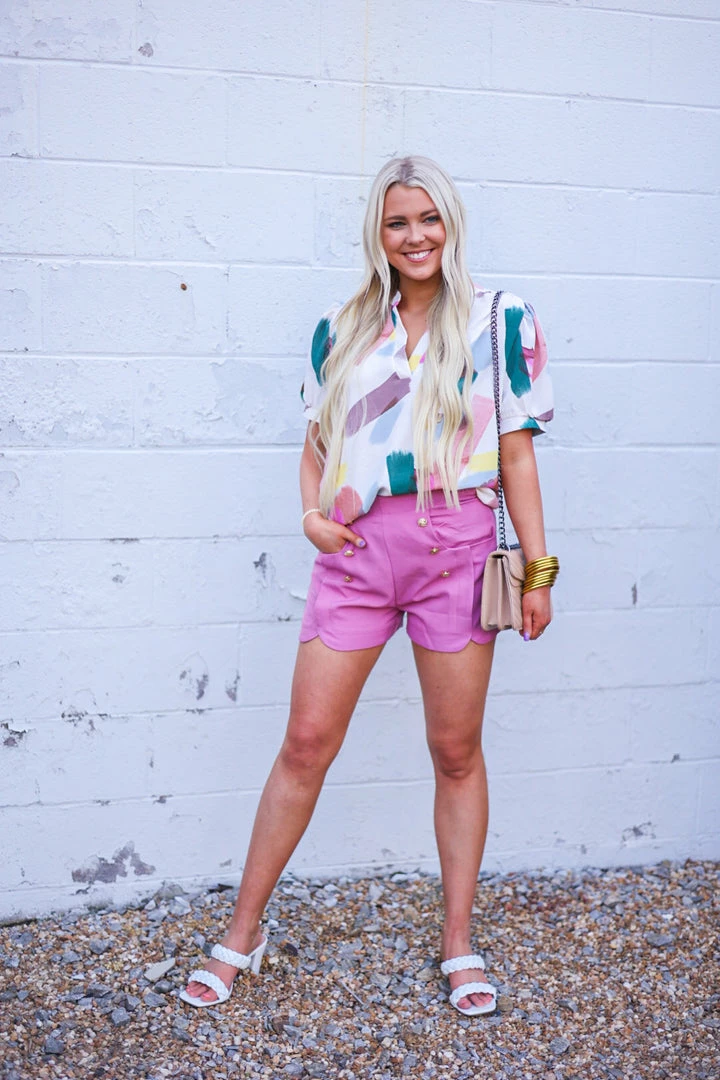 How pretty is this abstract painted print top!? Perfect for the upcoming seasons… just add your favorite jeans and booties, then shorts and sandals as the weather warms. Featuring a v neckline and gathered detail on the cuffed short sleeves. So cute! Colors: ivory, dark pink, dark blush, eggplant, sky blue, dark teal, and yellow.