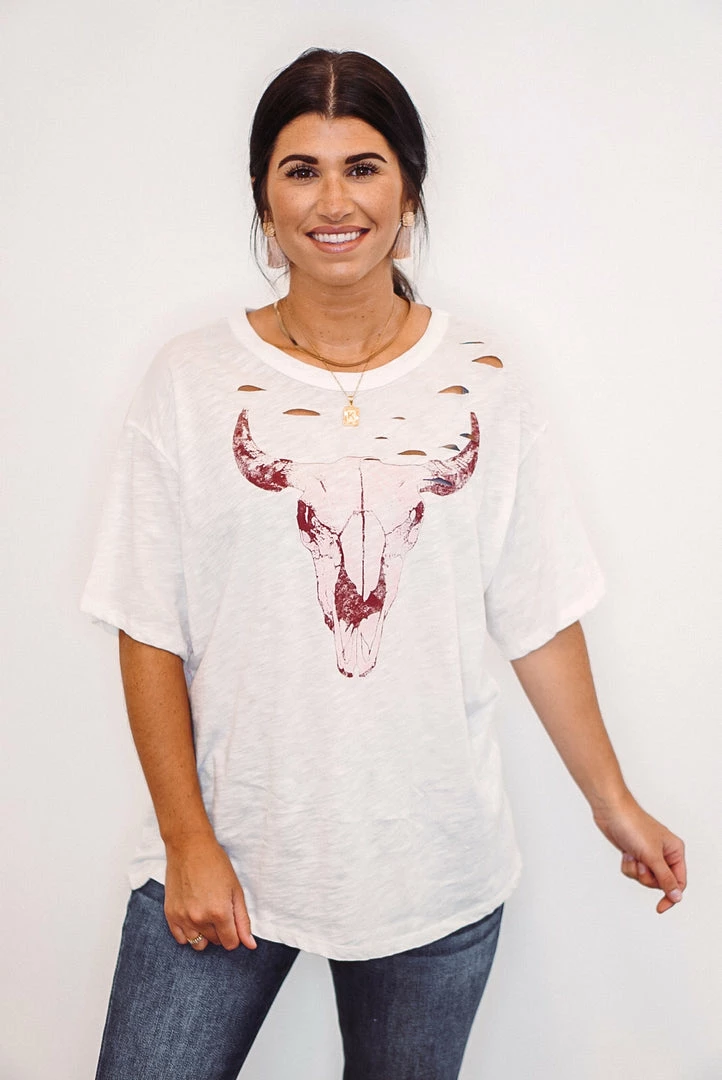 We all love a fun graphic tee, and this distressed two tone pink bull head one is cute, cute, cute. Oversized cotton slub, with just the right amount of distressing. Adorable and comfy!