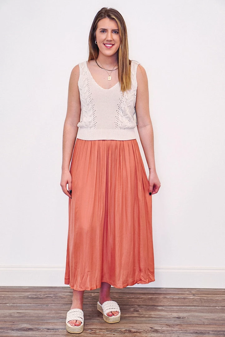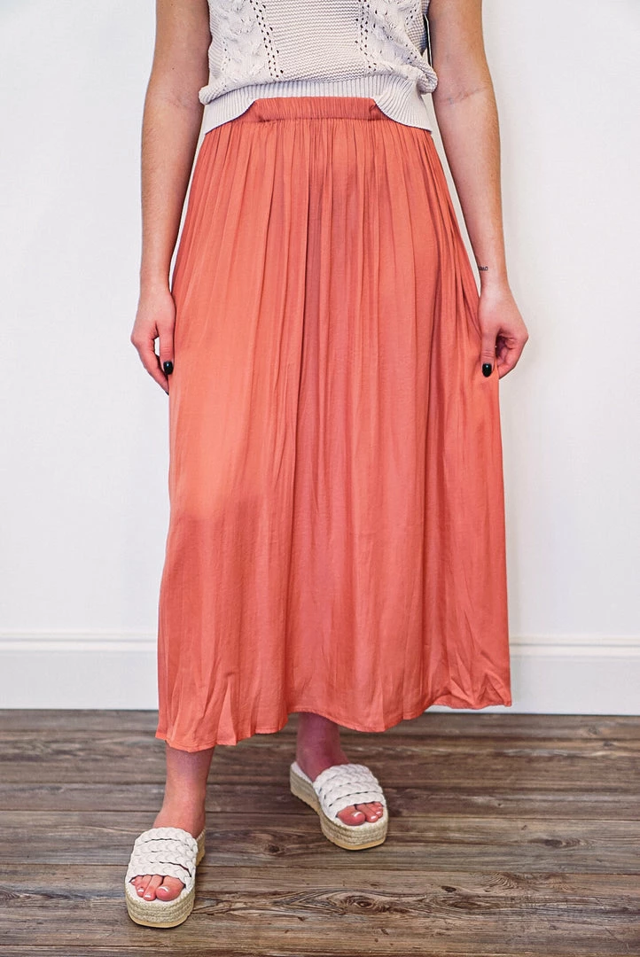 We are in cuteness overload with this adorable maxi skirt! Featuring an elastic waistline, side pockets, and slits on each side of the bottom hemline. The perfect skirt, simple yet so pretty!