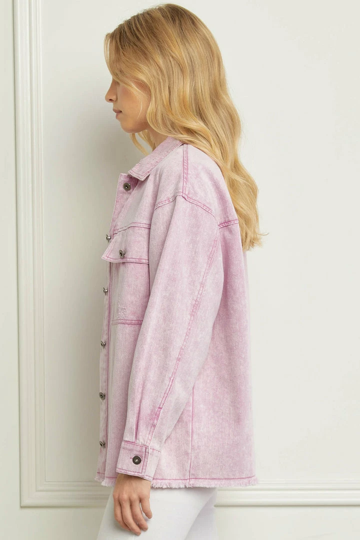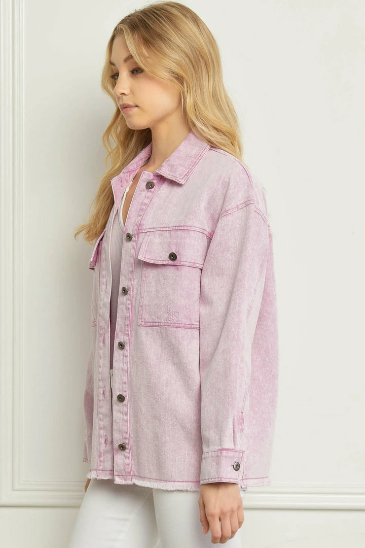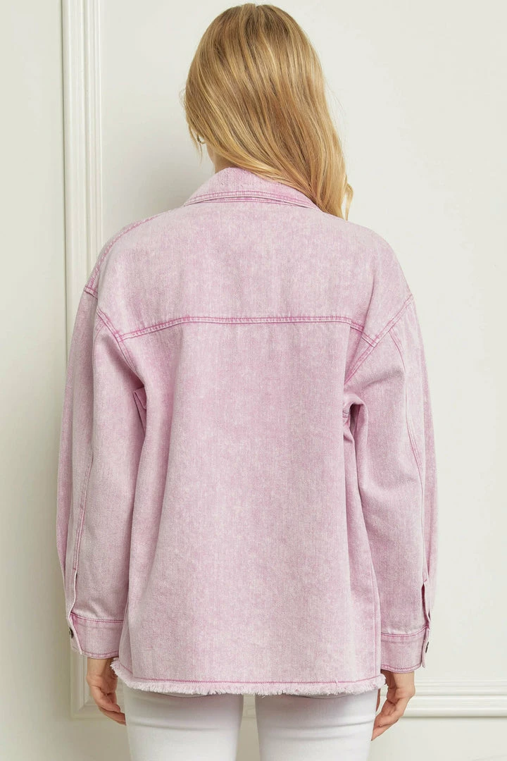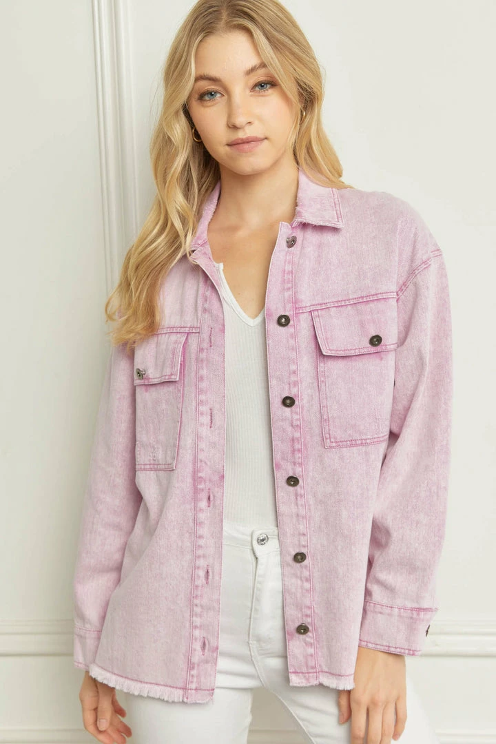 Denim jackets are all the rage, and this one will make your heart happy! Featuring washed pink distressed denim, and raw hemlines. This baby also has gun metal grey buttons on the front closure, front chest pockets, and sleeve cuffs. Lightweight denim jackets are so versatile, and are definitely a staple piece every closet needs. You’re going to love this one all year long over your fav graphic tees or fitted tanks!