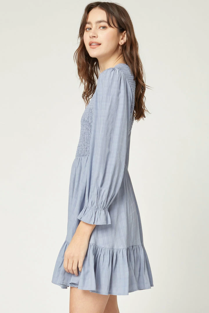 Dusty Blue Smocked Long Sleeve Ruffled Dress