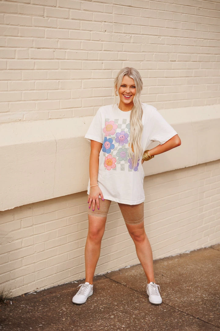 What a fun retro graphic tee! Oversized fit in vintage white with heavy distressed multi-color smiley retro flowers on checkered background. Just too CUTE!!