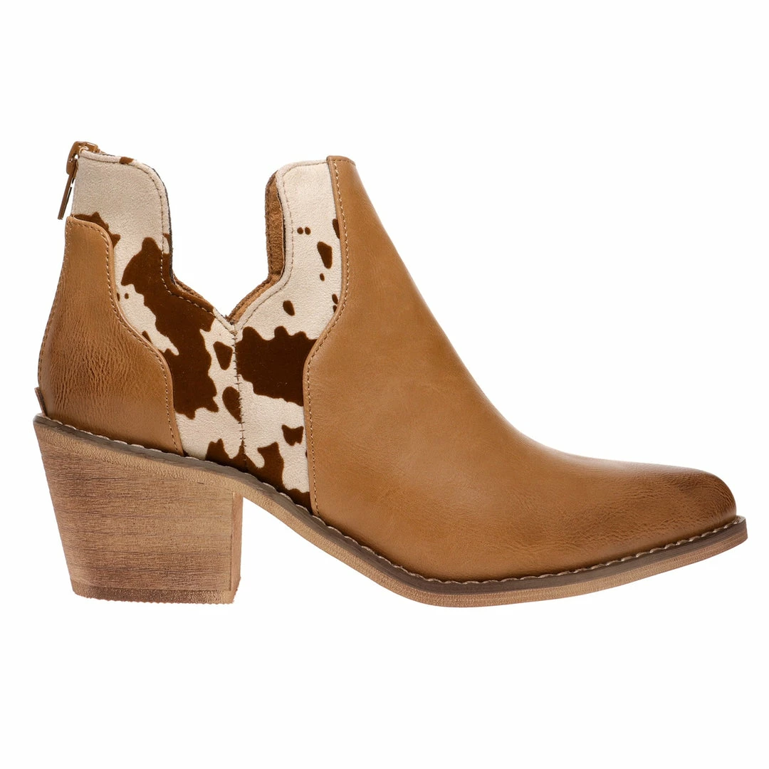 Beige cow print suede western ankle boots.