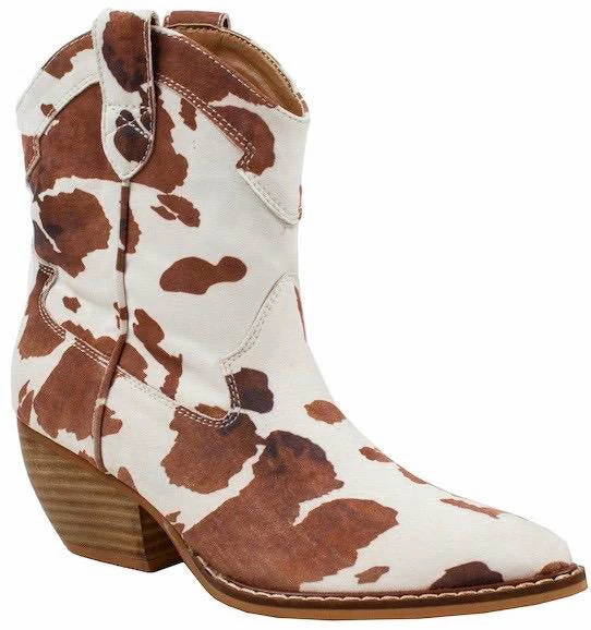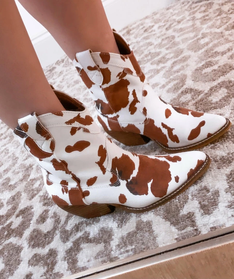 These sassy cow print western booties pair great with any outfit! The perfect shoe to go with everything from jeans and a graphic tee to skirts and sweaters. We love the suede like fabric and block heel for a classic combo. Perfect for your country concerts and wild west adventures!