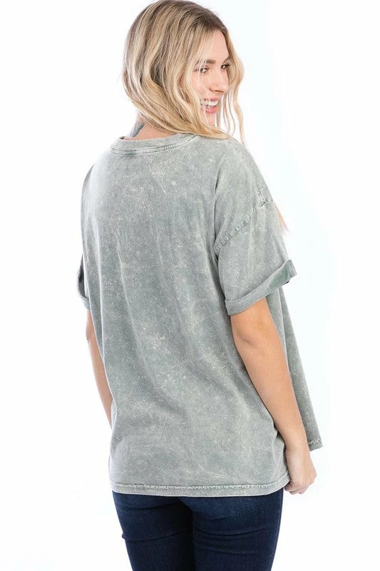 Everyone loves a cute graphic tee! This babe is mineral washed green and features the classic Longhorn graphic with the words Wild Spirit all in rust and white. Perfect with your distressed denim and boots!