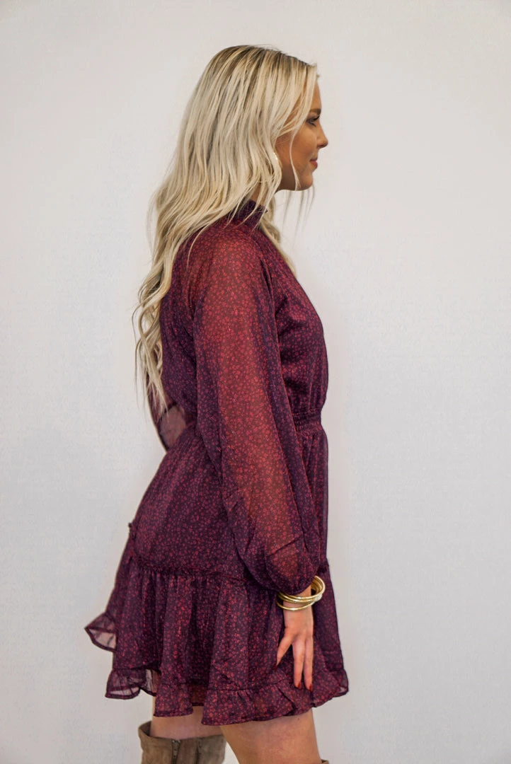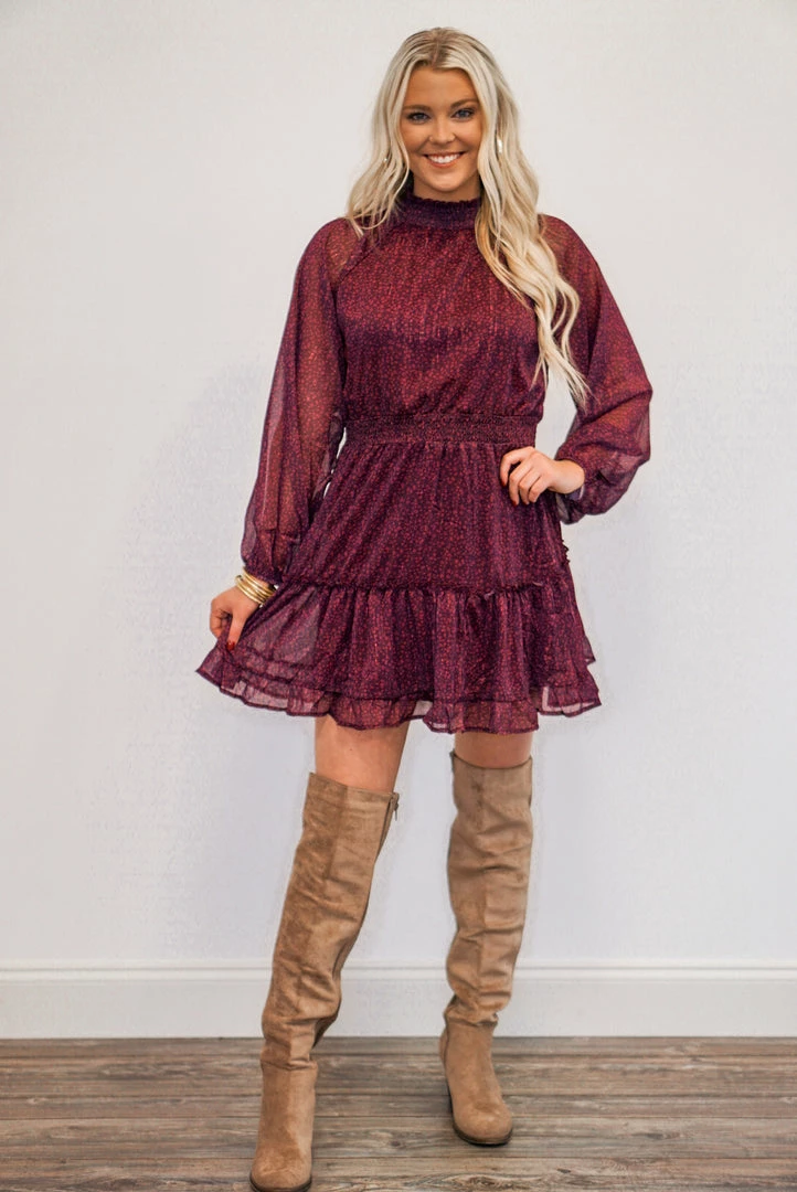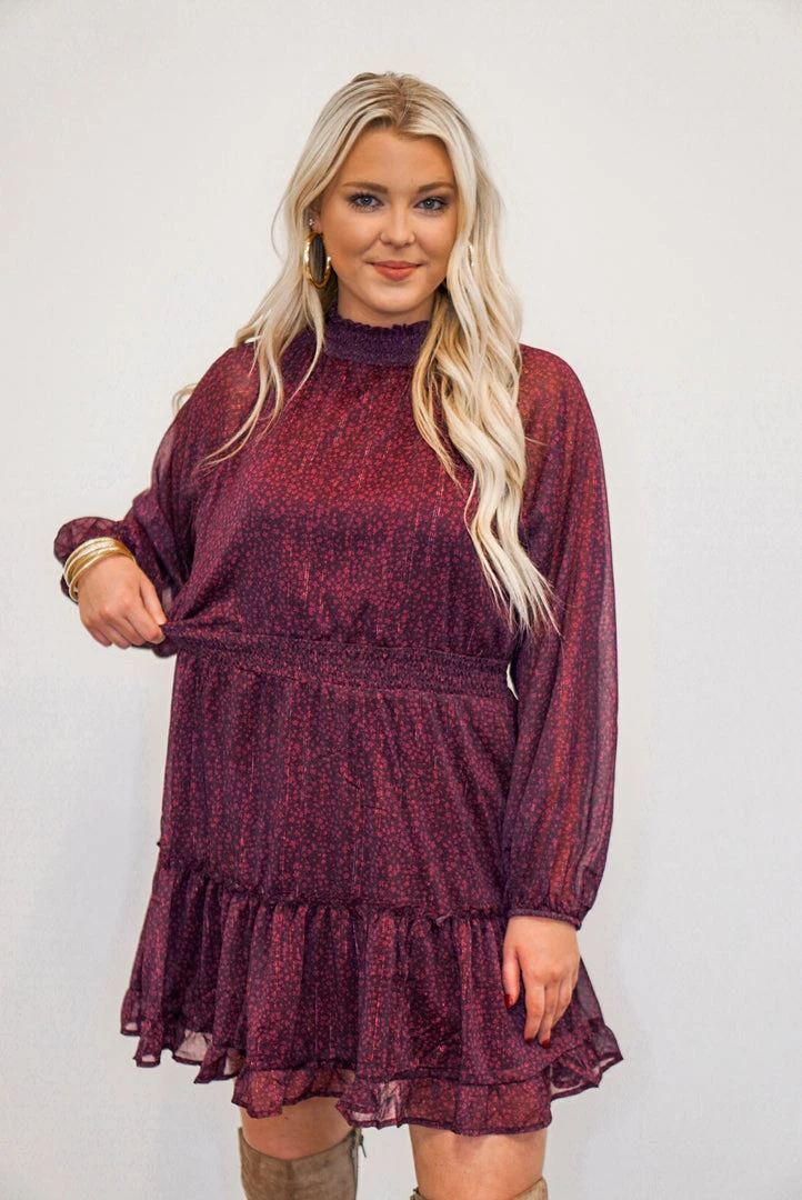 Oh my, oh my!! This babe is soooo cute! Wine colored dress with berry floral print pattern. Featuring double button keyhole closure in back of the smocked mock neck, elastic cuffed long sheer balloon sleeves, a smocked waistline, ruffled bottom hemline, and gold metallic stripes woven throughout for just the right amount of shimmer. Perfect dressed up for all your upcoming events… such a pretty addition to any closet!