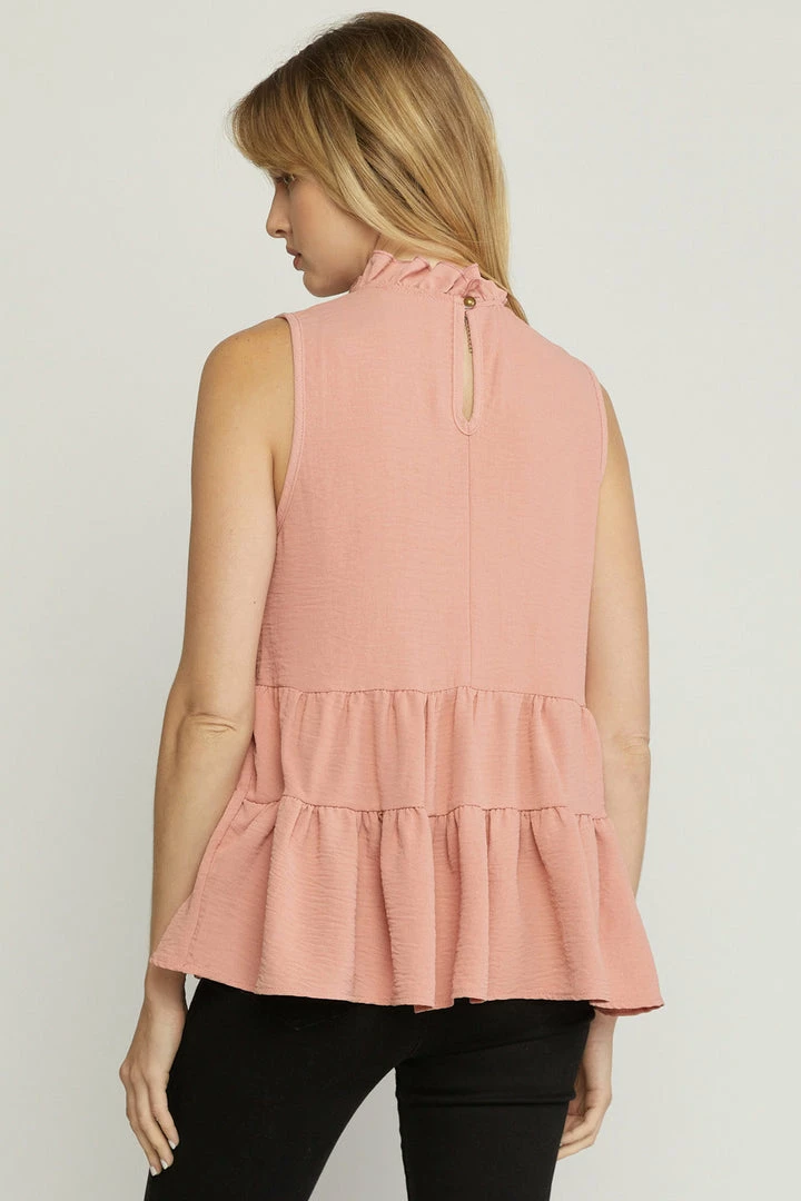 The perfect little babydoll top for all of your upcoming occasions… just add your favorite jeans and sandals or booties and you’re set. Sleeveless solid tank with a ruffled mock neckline, keyhole button closure in back, and tiered layers. So cute!