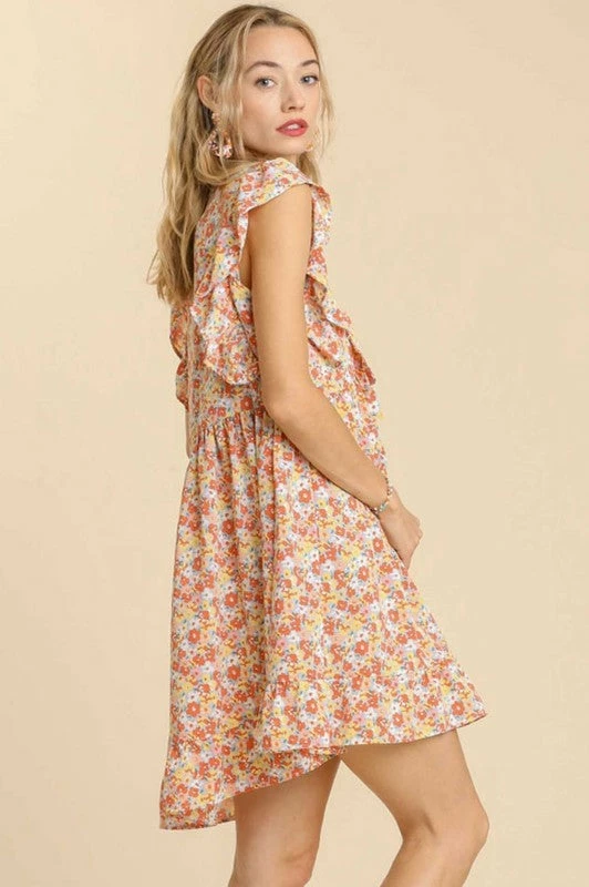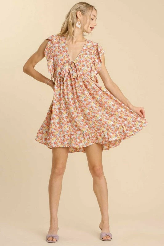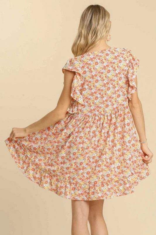 Tangerine Floral Flutter Sleeve Babydoll Dress
