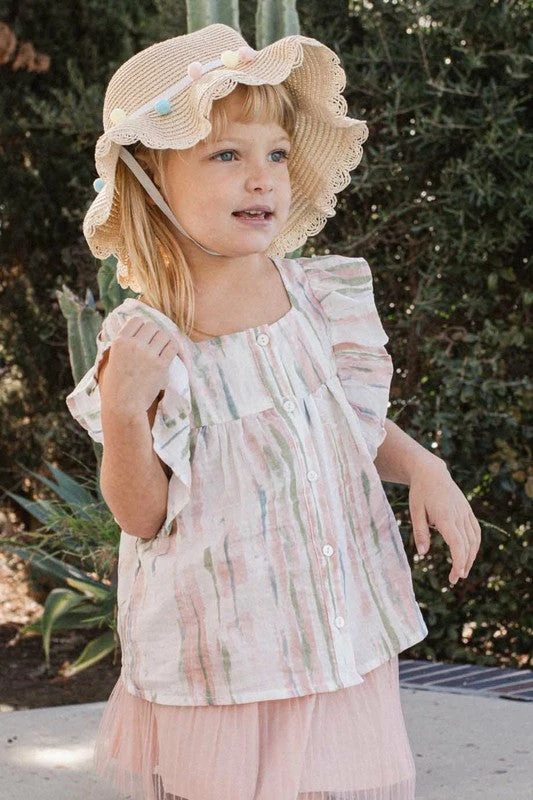 Your little one will love this cute ruffled top! Watercolor printed fabric, featuring a square neckline, ruffle capped short sleeves, and buttoned front. So adorable! Colors: Off white, light pink, and light olive