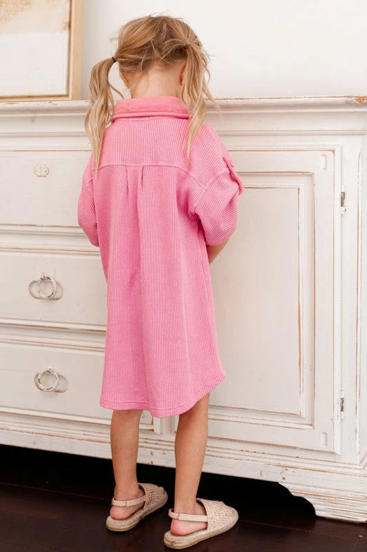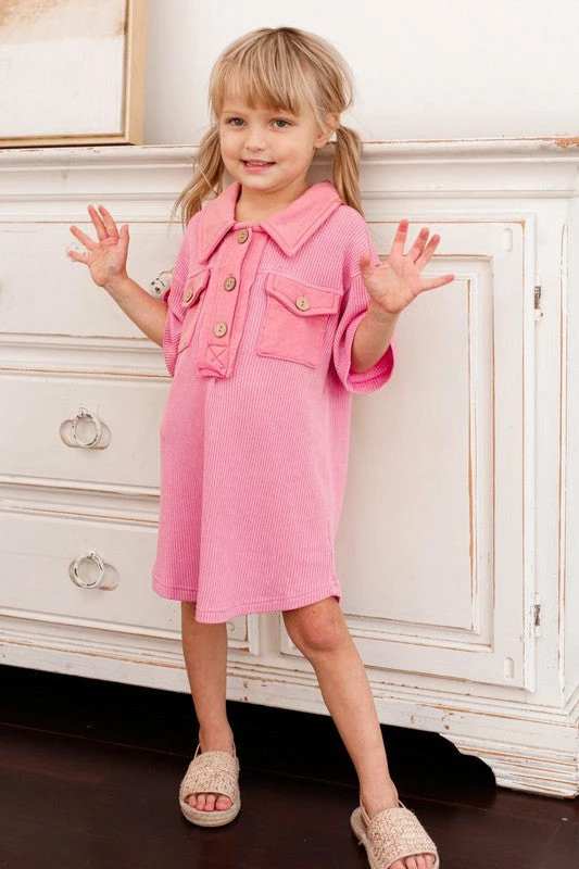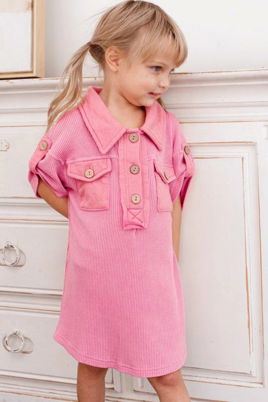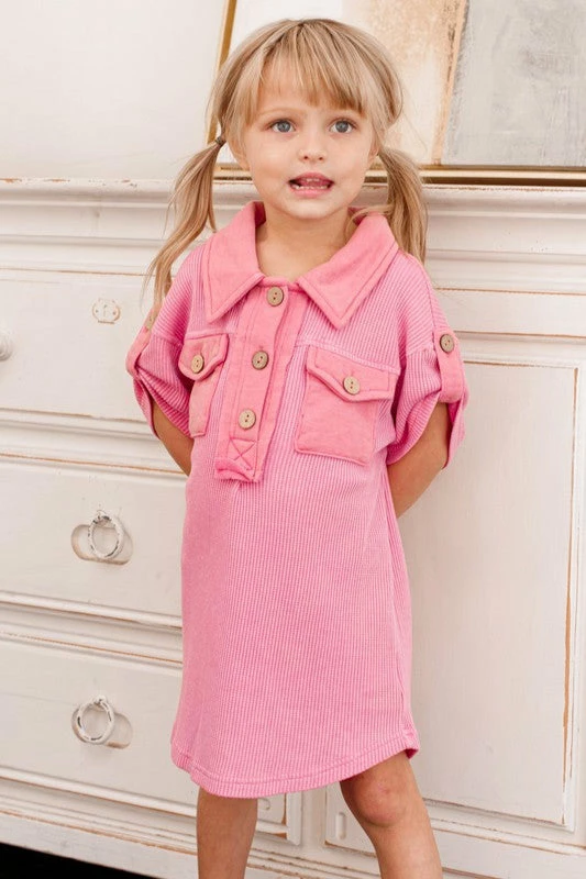 Your little one will love this cute dress! Washed pink knit shift dress featuring button front neckline, double front chest pockets and short sleeves with tab detail. So adorable!