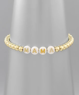 The hottest new stretch bracelet! This cute stackable gold ball bracelet features the word Mama in white beads with gold writing. Perfect worn alone, or stack with your other favorite bracelets!