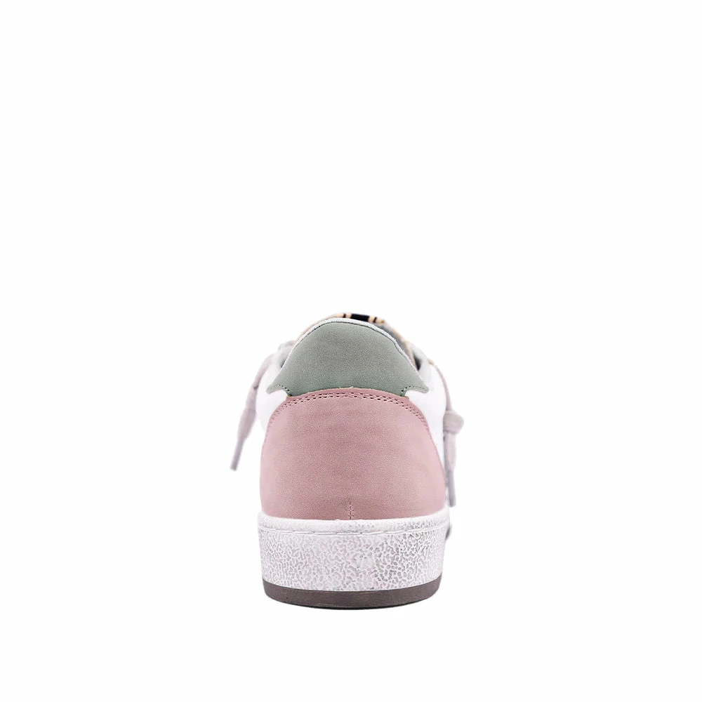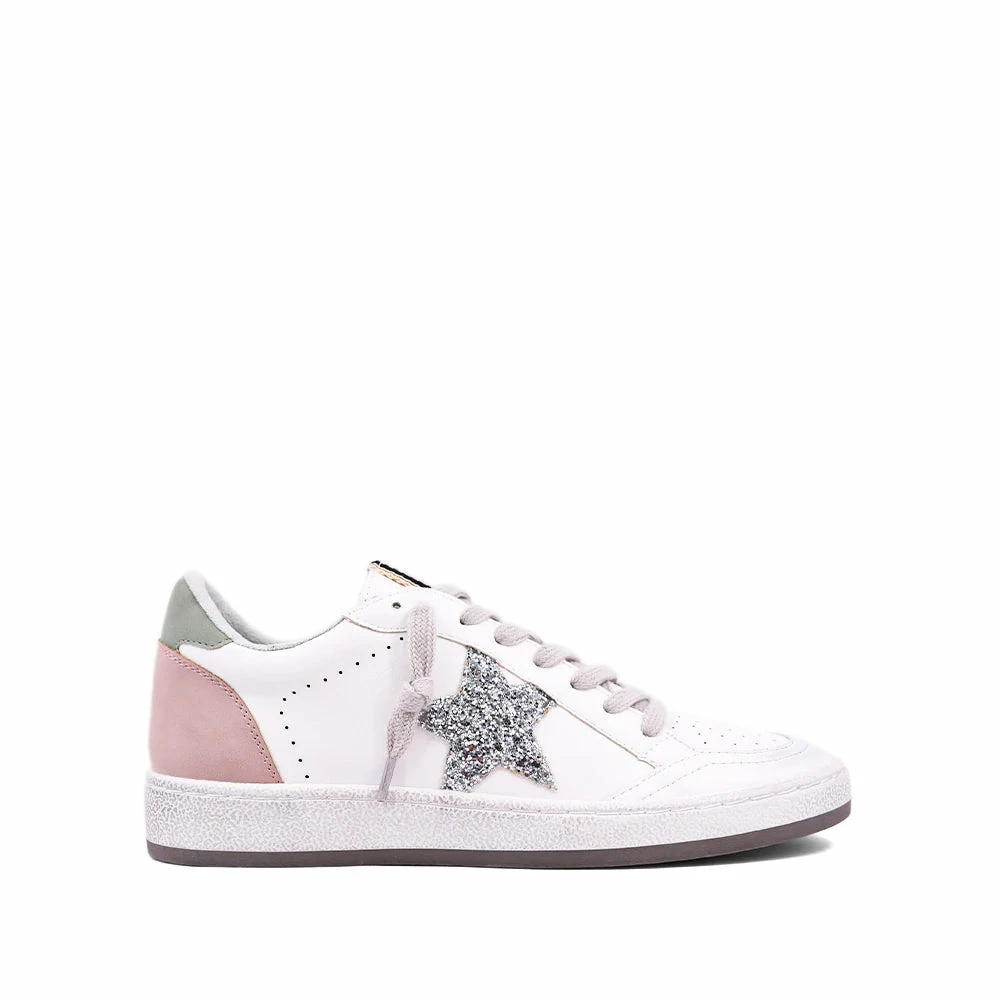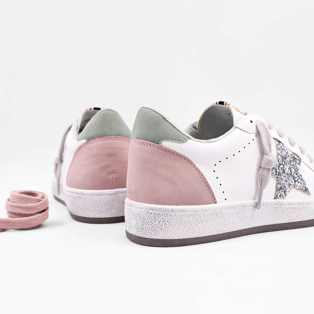 Meet one of new favorite sneakers. Paz, from SHU SHOP is an effortlessly cool pair of white and pink leather sneakers with a shiny silver glitter star. These sneakers are lightweight and comfortable enough for everyday wear, whether you’re headed to the gym or brunch with friends. The Paz sneaker features a white leather shoe with pink and green suede on the heel with a silver glitter. Comes with grey and pink laces.
