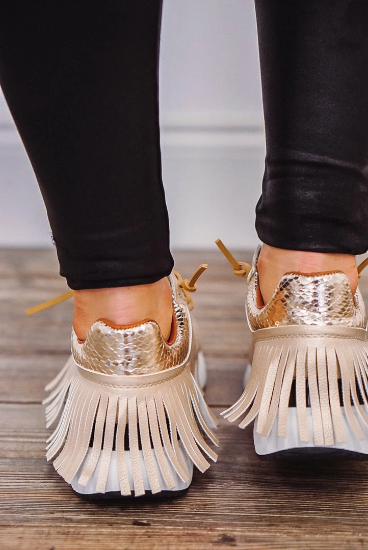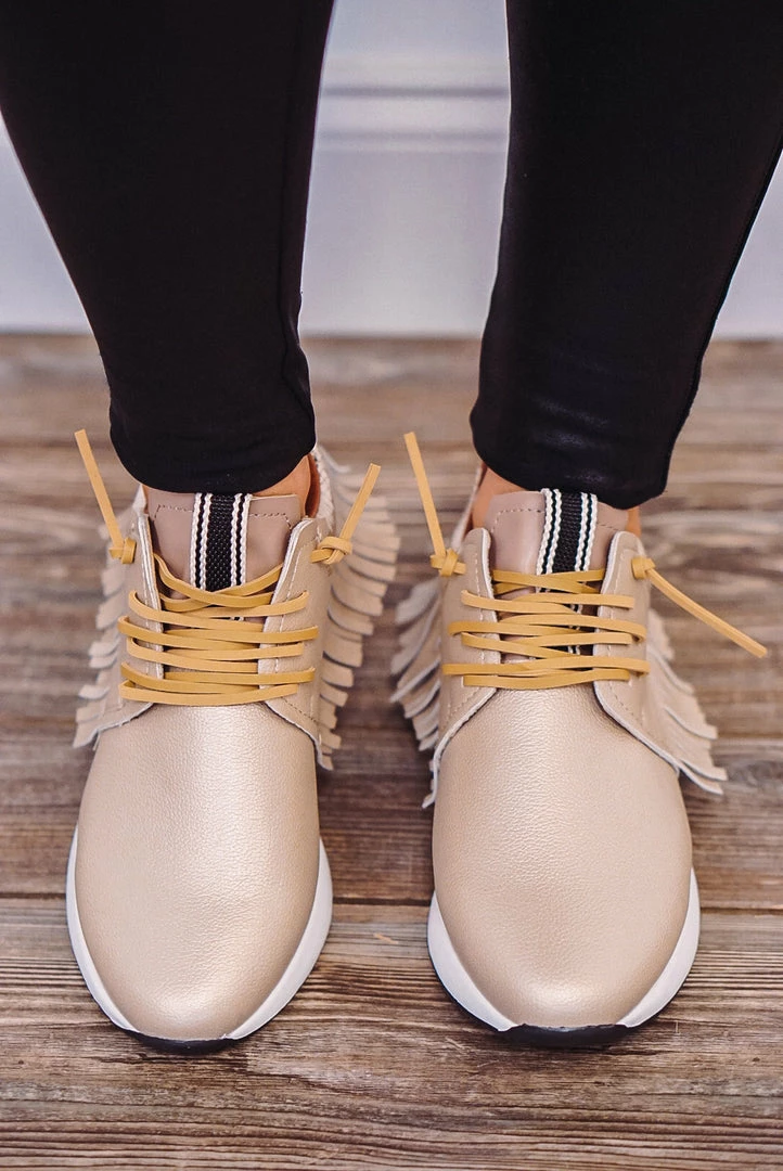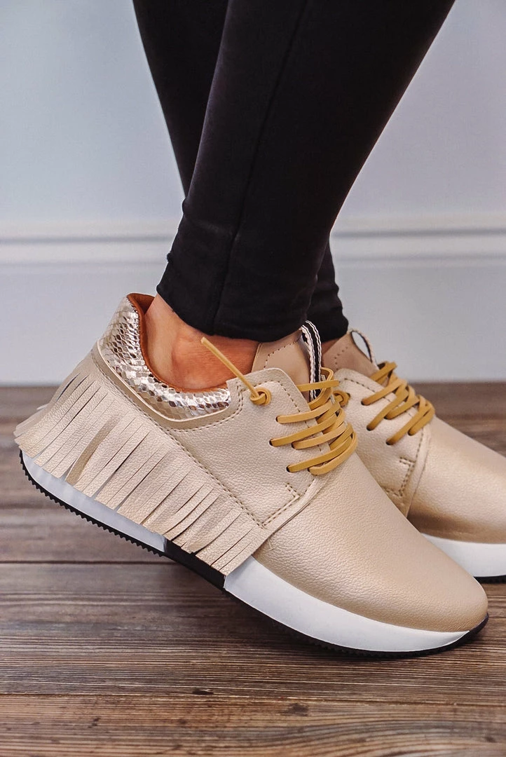 Shu Shop Pepa fringe faux leather gold sneakers.
