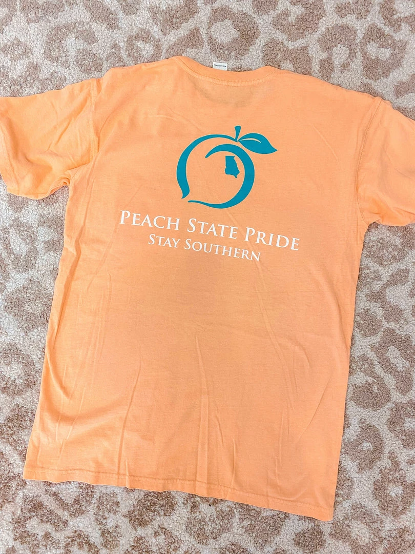 The classic stay southern Georgia peach t shirt in this fun color for summer! Peach t shirt with a teal peach. Front pocket t shirt.