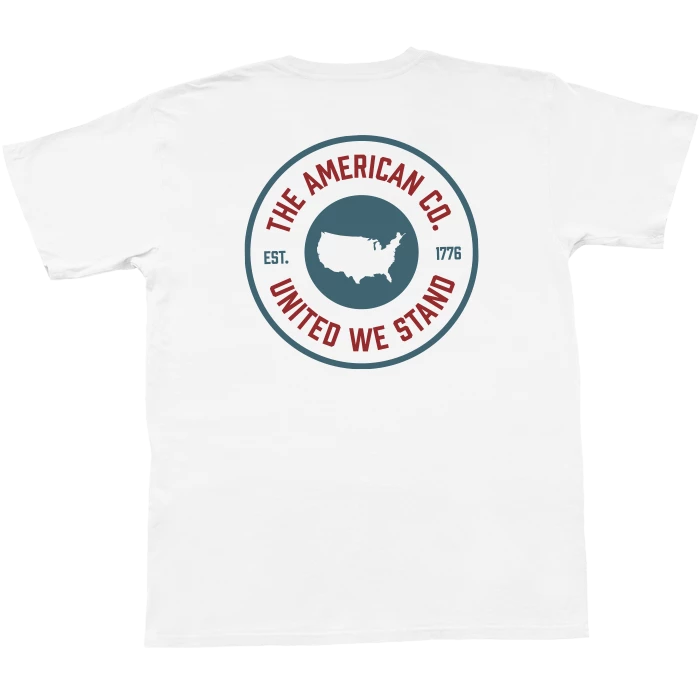 American Co. cotton short sleeve white pocket t-shirt with a classic fit featuring American Co. Patch Design. Also available in adult!