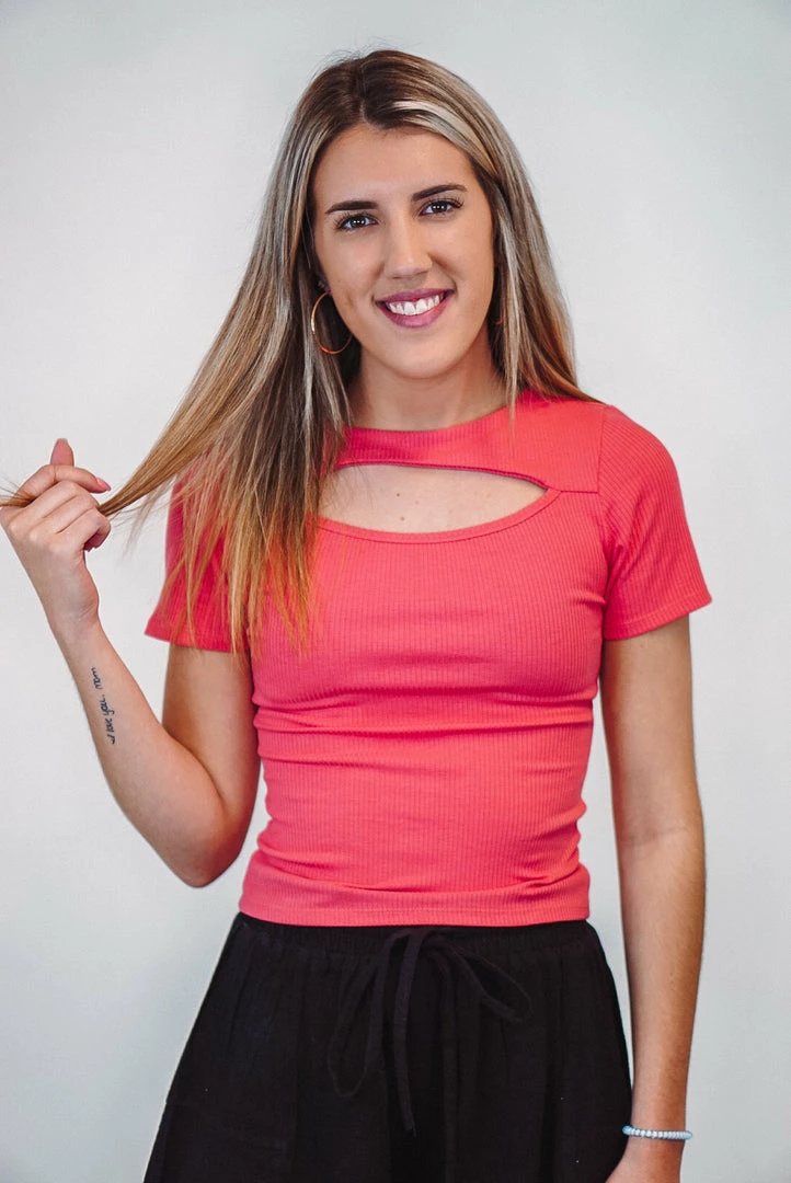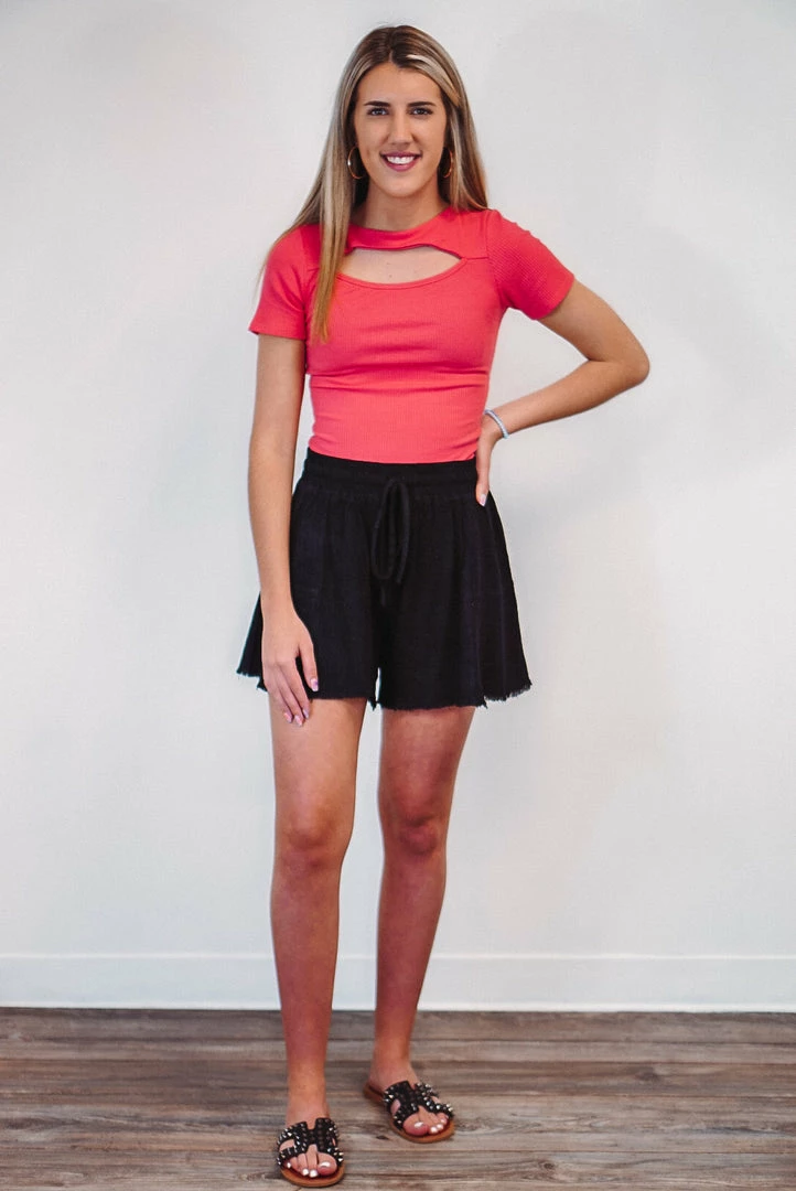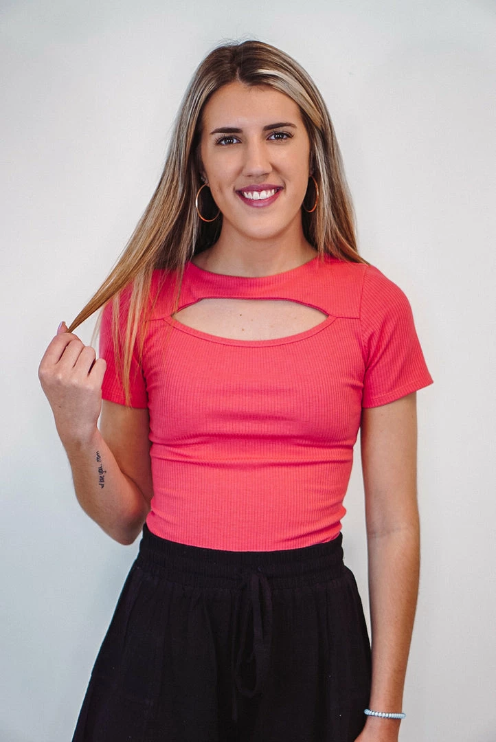 Something about this top just has us in love over here! We can’t get enough of tops with cut out detail – such a hot trend right now. This musth have closet staple features a bodysuit fit/appearance, but is a TOP! Super fitted so it’s very flattering and a great option for tucking in and wearing with high waist shorts/skirts.