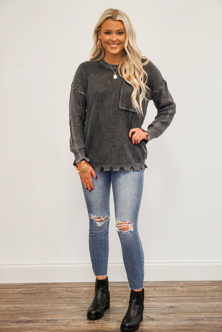 We know you’re going to love this cozy charcoal sweater! Featuring a mineral washed chunky knit, crew neckline, a front chest pocket, and distressing on the bottom hemline and the cuffs of the long sleeves. The color is so pretty, and the fabric is perfect for the upcoming chilly weather. Love this paired with distressed denim and some boots for a perfect Winter look!