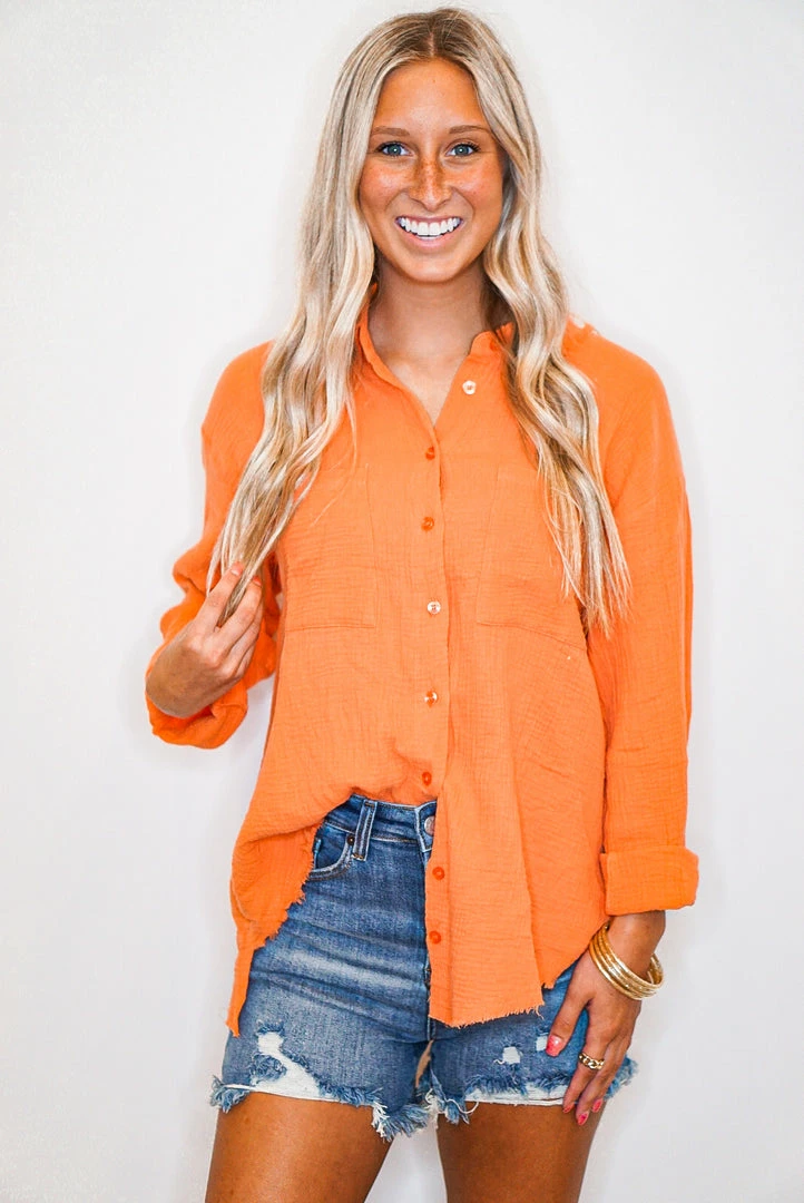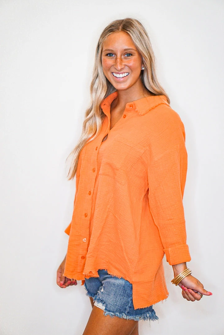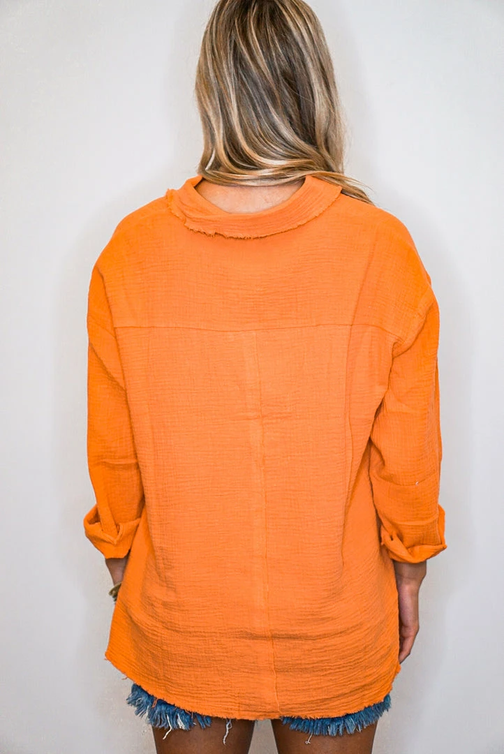 A super cute twist to the average button down! This babe is orange lightweight gauze fabric in a button down style, with tiered detail in back, hi-low bottom hemline, and raw seam details. She’s a relaxed fit and very comfortable. Wear her as a layering piece for those chilly evenings out, or as a swimsuit cover on those hot Summer days. She’ll be perfect either way!