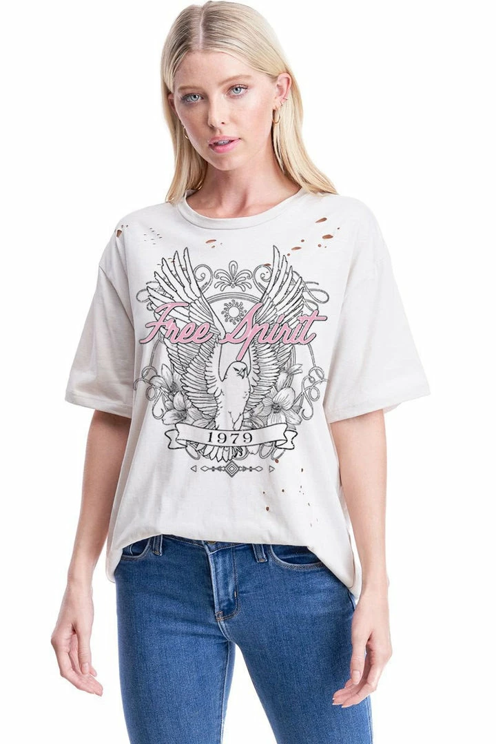 This vintage free spirit graphic tee features distressing (small holes) throughout. Style with literally anything for a comfy and on-trend look. Light khaki tee with pink, black & white detail.