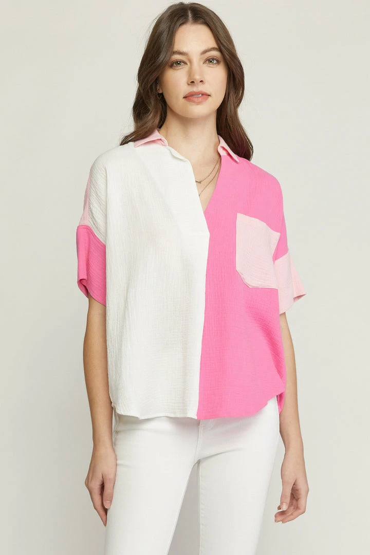 A very trendy twist to your average Summer top! This colorblock cutie is fuchsia, light pink, and white lightweight gauze fabric, with a collar, and super cute button detail down the back. She’s a relaxed fit and very comfortable. Perfect worn down straight, or with a front tuck!
