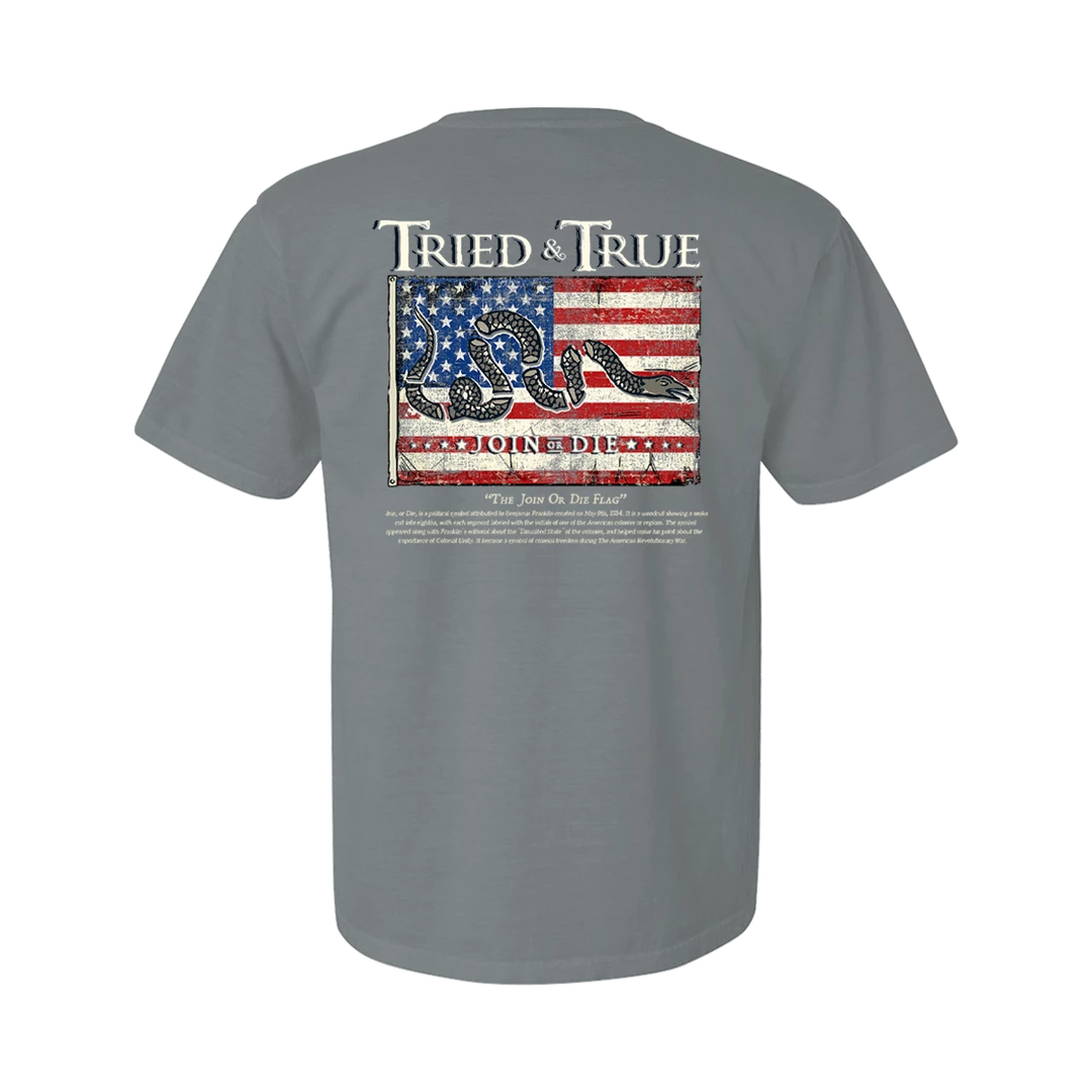 Design: Printed on a Comfort Color Granite colored t-shirt the join or die flag is the American Flag with a Snake Broken into pieces. Underneath is a small historical fact about the flag.