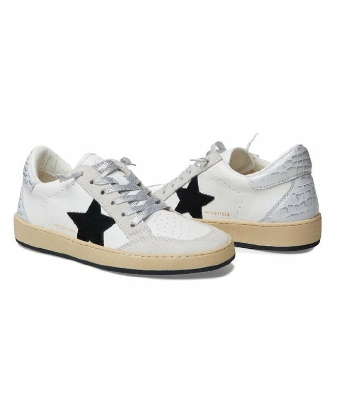 The trendy, edgy black star and the silver shoe laces give this classic sneaker a whole new vibe and we are loving it! This is going to be a new favorite of yours. These sneakers are sleek, comfy and on trend! Very versatile, pair them with denim, dresses, joggers or shorts for a comfy trendy look. White sneakers with black star detail and elevated sole. Cushioned insole. Terry lined.